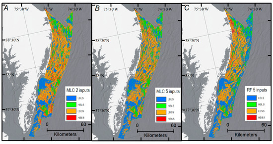 (A) MLC with two inputs, slope, and ISO-classified backscatter for the whole survey area. (B) MLC with five inputs, slope, ISO-classified backscatter, bathymetry, hillshaded-relief, and curvature. (C) RF with five inputs, slope, ISO-classified backscatter, bathymetry, relief, and curvature.
