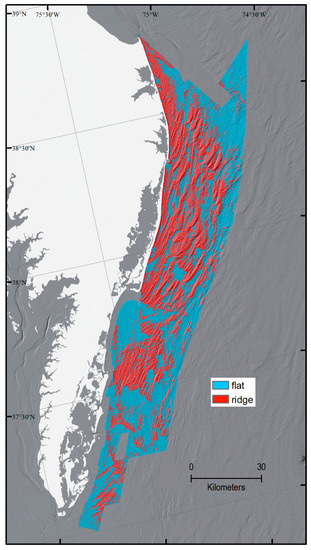 The surficial sediments of the inner-continental shelf from Cape Henlopen to the mouth of Chesapeake Bay have been described as arkosic to subarkosic sands [53,54,55,56]. Sand ridges interspersed by zones of flat seafloor characterize much of the northern half of the Delmarva inner-continental shelf [37,57,58] (Figure 1). The sand ridges are mobile and locally bury a transgressive surface [37,53,59,60,61,62], which results in local differences in grain size [53]. Fewer sand ridges are found on the inner shelf off Chincoteague Bight and the Virginia barrier islands (Figure 1). Here the less-undulating seafloor is composed of a discontinuous sheet of medium to fine sand and gravelly sand, with a muddy sand area located within Chincoteague Bight [38,63,64].