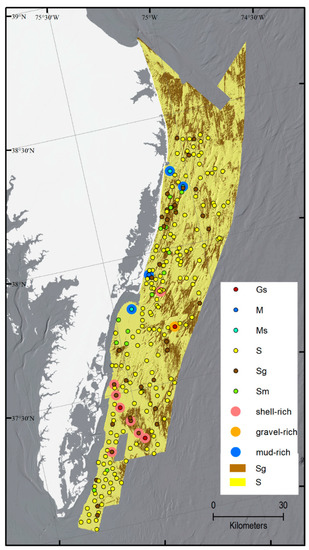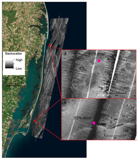 Other samples that differ from the average sediment statistics for each class are shown in Figure 9. Most mud-rich samples are explained by their occurrence in small-scale sub-circular and linear features, except for the mud-rich samples in Chincoteague Bight. These muddier than average samples reflect the sediment texture across a fairly large area of muddy sand that is associated with dewatered backbarrier muds or an ebb plume of suspended sediment [51]. However, this change in seafloor texture is not recognizable in the acoustic data [38] and, therefore, would not be identifiable by a classification relying on acoustic data. Gravel and shell-rich samples exist in a few locations throughout the survey and are often associated with bioherms as indicated in the bottom photographs [34,35], or occasional coarser-grained (than average HBLS) flat areas of high backscatter.