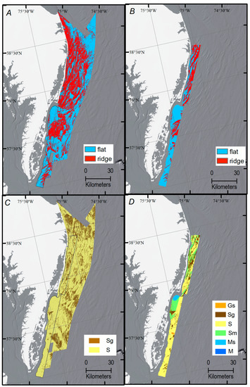It would be misleading to provide these generalized and regional-scale textural and geomorphologic classifications without outlining the limitations and assumptions that resulted in the classification outcomes presented here. A good way to illustrate application scale and areas where generalized geologic maps may not capture all the seafloor variability for evaluation by managers and other data users is to display the sediment sample locations along with the classification, thereby identifying the areas where differences in classified texture and actual sediment texture may exist, and where further discrimination or more detailed analysis may be required. Previous regional geologic studies of the Delmarva inner-continental shelf have defined the seafloor as relatively homogenous, consisting of primarily sand [52,55], and this study conducted using simple classes with mean grain-size statistics would seem to confirm this description, such that the majority of textural variability along this inner-continental shelf can be explained by relatively small changes in sand concentration, identified using only two sediment texture classes (Figure 9). However, a more heterogeneous sediment environment, especially one in a periglacial environment, where all sediment types are possible and often adjacent, would require more complex substrate classes and input data types, such as the secondary features defined by [41].