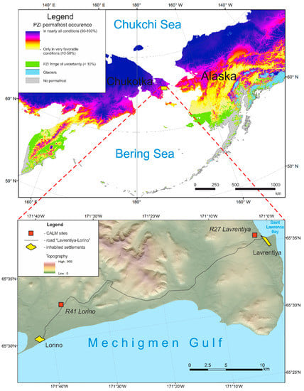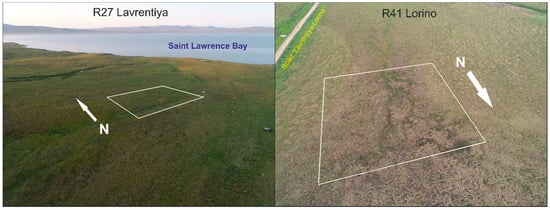 There are two sites for measuring the active layer on the plains of Eastern R27 Chukotka: Lavrentiya and R41 Lorino (Figure 1 and Figure 2). They both are part of the program for Circumpolar Monitoring by the Active Layer (CALM) program [31,32]. In terms of landscape, both sites represent Tussock-sedge, dwarf-shrub, moss tundra (G4) and Sedge, moss, dwarf-shrub wetland (W2), covering almost 25% of the Eastern Chukotka coastal plains area (Table 1) [33].