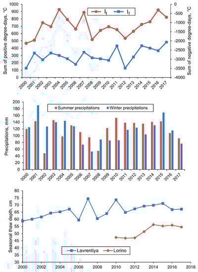 Thaw (It) and frost (If) indexes, summer and winter precipitation amounts, and seasonal thaw depths at Lavrentiya and Lorino CALM sites variations for 2000–2017.