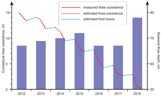 Regular observations of soil surface level relative to the steel stakes hammered into the permafrost at the Lavrentiya site enabled the tracing of soil surface movement rates (Figure 5). Stakes heights determination in the middle (July) and the end (September) of thaw periods provided measured thaw subsidence values (red solid line), while the difference between stakes heights in July and September of the previous year gives summarized values of frost heave (blue dotted line) and thaw subsidence for the beginning of thaw period (red dotted line). For the period 2012–2018, the rate of soil subsidence was 0.019–0.067 cm·m−1 (average 0.041 cm·m−1). Depending on the season, the values were up to 13.9 cm·m−1 while the average thawing depth on the site reached 70 cm. At the same time, the amount of frost heave is 0.008–0.040 cm·m−1 (average 0.023 cm·m−1). The correlation between thaw depth and subsidence value is significant (r = 0.75, n = 60 to 121 depending on year): the deeper the soil thaws are, the higher the subsidence value is. The frost heaving of the soil could not compensate for the value of thaw subsidence during these years; therefore, the rate of the soil surface lowering was 1.5–2.7 cm·a−1 (average 2.1 cm·a−1), and the total amount of subsidence was 14.6 cm for 7 seasons. Thus, for the period 2012–2018 the lowering of permafrost table for Lavrentiya was 2.6 cm·a−1 due to ALT increase and surface lowering.