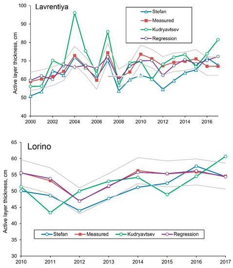 Compared to the other models, the Kudryavtsev one shows the overestimated values of predicted ALT for Lavrentiya site. At the same time, despite the relatively low degree of compliance with the measured values for the Lorino site, the results of calculations according to the Kudryavtsev equation correspond to the other two models here.