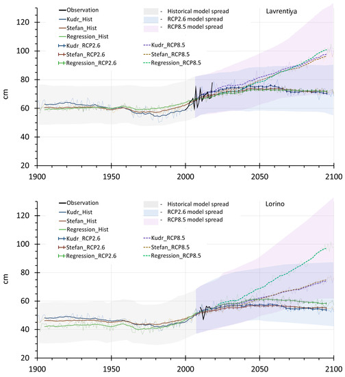 Historical and projected ALT dynamics for the Lavrentiya (upper) and Lorino (lower) CALM sites based on 3 models and RCP 2.6 and 8.5 climatic scenarios. The uncertainty bound (model spread) is calculated as described in Section 3.3.