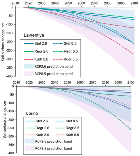 The calculations of thaw subsidence dynamics, depending on the climate scenario and the model used, are shown in Figure 9. With RCP 2.6 climate change scenario, the subsidence rate will be constant, and for Lavrentiya it will be 0.8–1.5 cm·a−1, and for Lorino 0.4–0.8 cm·a−1 resulting in a decrease of 62–119 and 28–60 cm respectively by the end of the century relative to the level of 2017. With RCP 8.5, the rate of surface lowering increases nonlinearly, reaching 6.7 cm·a−1 by 2090–2100 (the Stefan model for the Lorino site). The total subsidence by the end of the 21st century, therefore, increased several times: 211–276 cm for Lavrentiya and 125–261 cm for Lorino.