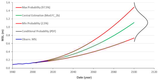 For different MSL data series and different methodological approaches, Antunes [] showed a set of relative SLR projections for the 21st century, based on which the author generated a probabilistic ensemble used to compute an SLR probability density function at epoch 2100.