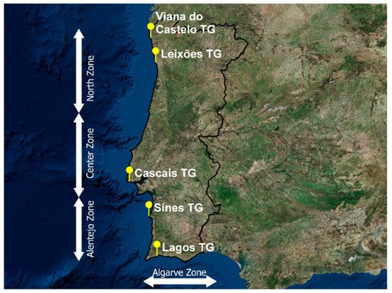 Tide models were estimated based on historical data from the Leixões, Cascais, Sines, and Lagos TGs. Thus, each national wide scenario is a composition of four territorial zones: North, Center, Alentejo, and Algarve. Except for the Cascais TG, which has the longest tide series, all the other TGs (Leixões, Sines, and Lagos) have shorter and incomplete data series for the 1970–2010 period.
