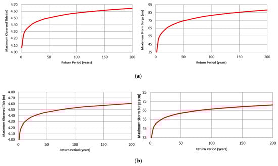 Return period curves for the maximum observed tide (left), relative to the TG chart datum, and the maximum storm surge (right) for: (a) the Viana do Castelo TG (1978–2008 data series); (b) the Cascais TG (1959–2018 data series); (c) the Lagos TG (1986–2018 data series).