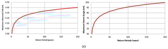 To evaluate and characterize the SS for the TG data series, a harmonic analysis was preformed, and the maximum storm surge series were updated for further analysis using the simple Gumbel distribution (Figure 3a–c).