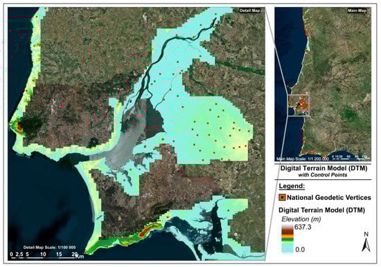 Digital Terrain Model of the Atlantic Coast of Portugal’s mainland, with a spatial resolution of 20 m and 56 cm of relative accuracy estimated using the National Geodetic Network.