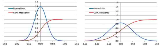 Centered normal distribution and cumulative frequency of the 2050 (left) and 2100 (right) extreme flood levels (EFLs), corresponding to 12 and 40 cm of standard deviation, respectively.
