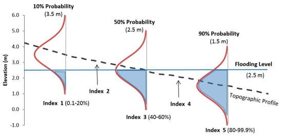 Method for the flooding probability calculation and the EFHI on a generic topographic profile (3.5 m, 2.5 m, and 1.5 m), based on the highest tide level (h = 2.5 m) and its uncertainty (based in Marcy et al. rule for flood confidence area estimation []). Intermediate EFHI levels, 2 and 4, are located between index levels 1, 3, and 5, respectively.
