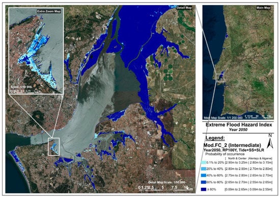 Figure 8 shows, for the ACPM, the 2050 coastal forcing scenario probability, within a zoom image of the Tagus Estuary and an extra zoom image of the Tagus southern margin at Cova da Piedade and Alfeite, in Almada municipality.