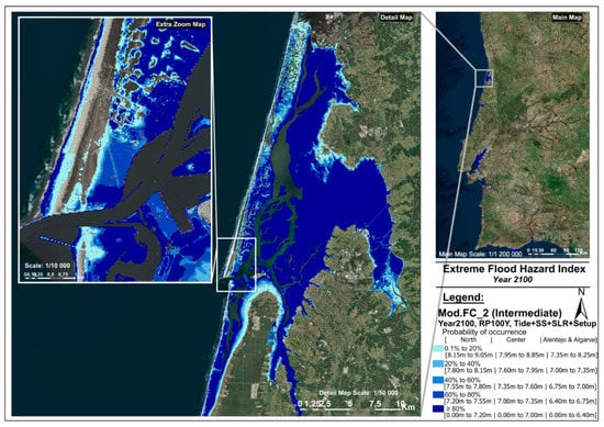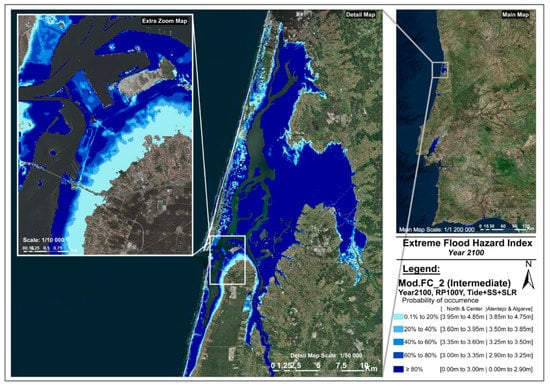 Table 8 presents the sum of areas for each hazard class and each Portuguese coastal district for the 2100 epoch. In addition, it is also shown that an area of 1146 km2 has the probability of flood in 2100 and that 74.6% of that area is classified as extreme. The Lisbon district will be again the most affected with an area of 249.6 km2 with a probability of flood.