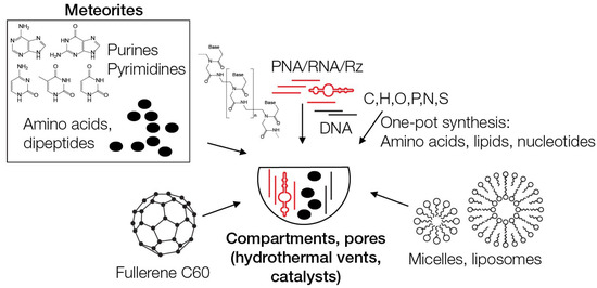 Nucleotide-like compounds such as purines and pyrimidines may have arrived on Earth with meteorites [12] (Figure 1). Abiotic synthesis pathways for both purine and pyrimidine nucleosides have been reported recently [17]. Short RNA molecules can form polymers chemically [18]. RNA was likely among the earliest biomolecules on Earth. RNA can replicate without protein-based polymerases, yet, it is a rather unstable molecule. Alternatives were proposed, including PNA (peptide nucleic acid) with more stable peptide bonds instead of phosphodiester linkages. Other possible structures may have been TNA (threose nucleic acid), GNA (glycerol-derived nucleic acid analogue), PLA (pyranosyl nucleic acid), or XNA (xeno nucleic acid) [12,19]. Amino acids can help stabilize RNA or ribozymes, and even increase their catalytic activity as discussed below