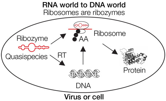 When did the DNA arise? The building blocks, deoxyribonucleotides, may have been produced by a chemical deoxygenation of ribonucleotides [21,40]. Then, DNA copies of RNA templates could have been synthesized by the action of ribozymes [41,42]. All this could have been possible before a reverse transcriptase protein enzyme, a hallmark of retroviruses, accelerated the reaction from RNA to DNA.