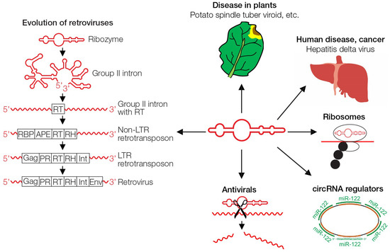 Multifunctionality of RNA. Ribozymes/viroids and related RNAs can cause disease in plants [50,51,52,53,54], contribute as HDV to liver cancer in humans [56], can perform peptide synthesis in ribosomes [28], act as regulatory circRNA [49], have been used for sequence-specific cleavage in gene therapy approaches [58], and ribozymes have evolved gradually to today’s retroviruses by acquiring coding information [47]. RT, reverse transcriptase; RBP, RNA-binding protein; APE, apurinic endonuclease; RH, ribonuclease H; Gag, group-specific antigen; PR, protease; Int, integrase; Env, envelope.