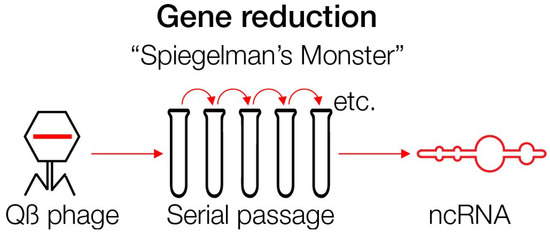 Gene reduction from long coding phage Qβ RNA to non-coding RNA by serial passages (simplified model).