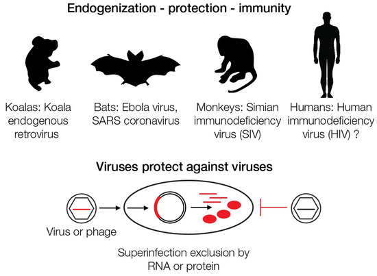 Viruses protect against viruses and phages protect against phages. The infection of a host cell can result in the exclusion of superinfecting viruses or phages. The phenomenon is exemplified in koalas, bats and monkeys, as discussed in the text. The possible emergence of resistance to HIV is speculative (modified from [67]).