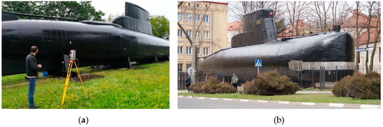 PNS Jastrzab—decommissioned submarine—object of research: (a) wet object during laser scanning with control points, (b) general view of the submarine (source: by Pawel Kusiak, CC BY-SA 4.0, https://commons.wikimedia.org/w/index.php?curid=42676502).