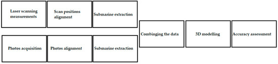 The presented ship hull is a challenging object due to remote sensing modelling techniques. Thus, it was intentionally chosen to stress the applied modelling methods and to highlight their pros and cons. The hull is painted with black paint, which highly absorbs the laser light beam. In addition, a rainy measurement day was chosen in order to point out the methods greater and to simulate real industrial measurement environment, where the freshly docked hulls are wet. The absence of texture and tie points makes this object hard to model by means of photogrammetric methods. In the case of object measurement, the hull was wet and it triggered an additional measurement demand for the sensors. Highly demanding object size, shape, and surface, complemented by challenges faced during the research, made a clear explicit display of the presented techniques in highly unfavorable conditions due to sensors and algorithms. The measurement conditions were prescribed in order to simulate and consequently assess the efficiency and accuracy of the applied sensors. The accuracy of sensors in unfavorable measurement conditions was assessed separately in the case of each applied technique. In order to eliminate the weakness of each separate technique with regard to the final object, multiple spatial data combining techniques were applied in the post processing phase of the research. The diagram (Figure 2) shows the sequence of activities leading to the 3D model of the hull. First of all, the measurements were made using a laser scanner (in order to detect the edge and shape of the hull) and the cloud of points obtained from the photographs. After combining, the photograph based data was supposed to fill the spaces between the edges, registered by the laser scanner impulse. The object modelling means fitting the shape of the hull to the obtained point cloud. In connection with market expectations and previously conducted tests described in the introduction, accuracy analysis of the model was made, assuming a boundary value equal to 1 cm.