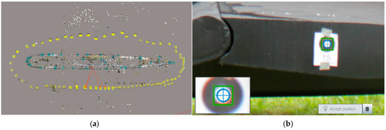 The object modelled with a photogrammetry technique: (a) tie points and camera positions for SfM modelling and (b) photogrammetric control point placed on the object.
