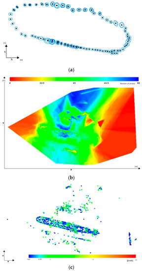 The object has been modelled by means of 159 photos, acquired by Canon EOS 550D (Canon Inc., Tokyo, Japan), with the image dimensions of 5184 × 3456 pixels recorded in the JPEG format. In the data acquisition process, more than 600 photos have been taken according to the presented object size. The dark color of the object, and highly light absorbing paint with a relatively vivid background made the acquisition a high demand. The photos rejected from the final calculation were either too dark or overexposed top parts of the hull. In that case, the surplus images acquired allowed us to select the ones with correct exposition. On the incorrectly exposed photos, the algorithm are not able to detect a sufficient number of automatic tie points. The overall number of tie points detected in the object is 15314 (Figure 3a), with a median number of 330 points per photo and with the median 0.44 pixels reprojection error. The median number of photos per point was equal to 4. Figure 4a shows the scene with marked camera positions and position uncertainties and Figure 4b presents the set of photos to potentially cover each area. The object in green denotes the amount of information on the object, taken from approximately 43 photos, due to the respective parts of the hull. The minimum reprojection error is 0.01 pixels and the maximum is 1.85 pixels due to the automatic tie point (Figure 4c). The automatic tie points have not been stated in selected parts of the object (top and bottom part of the hull). It is the result of insufficiency of textures. Nevertheless, exploring the automatic tie points done, the SfM algorithm unable to recover the ego motion (external orientation parameters - camera position and orientation), so the object could not be reconstructed correctly. The problem of wrongly matched images is bound to appear at the bow and stern parts of the object. In this case, the 33 manual (user-defined) tie points have been stated in the entire object, most of them situated within the problematic areas. The manual tie points are defined by the user. Their position on the images is pointed manually, theoretically on a minimum of three consecutive images. In the presented case, all 33 user-defined tie points have been pointed on all images to achieve sufficient visibility. It was a necessary step to start the reconstruction stage.