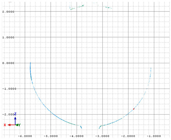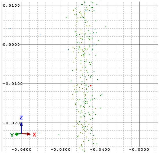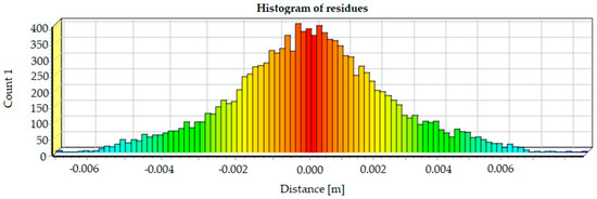 According to Figure 6, it may be clear that the maximum distance between the alignment planes is equal to 6 mm. Most of the planes belong to the group between 1 mm and −1 mm, according to their spatial position. Based on the values of residues, the standard deviation may be estimated where the accuracy of the scan alignment can be approximated. The standard deviation equals 2 mm. Based on that information, the accuracy of the point cloud can be less than 1 cm, according to the possibilities of spatial data acquisition by the Riegl VZ-400. The accuracy of the measured points equal 5 mm.
