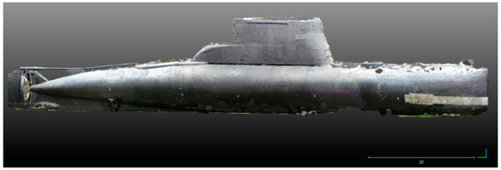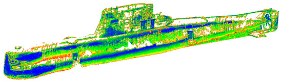 Mapping of the bottom parts of the model is much better in the case of the upper ones. The reasons are rain, insolation, and black material covering the submarine. The results provide a valuable spatial information for further analysis and modelling. The collected data may be a modelling dataset only or possibly combined with other techniques presented in the article. In order to assess the quality of the obtained data, the cross section was created and presented in Figure 10.