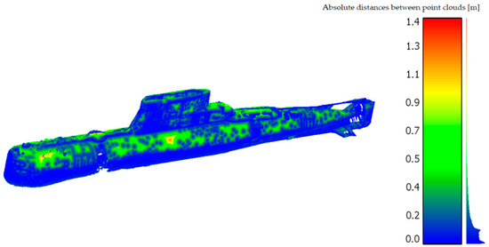 At the very beginning of the discussion, there is a need to focus on the measurement conditions. They were marked by high insolation and rain, to possibly prevent the inventory from being carried out. The main purpose of choosing such difficult weather conditions was to assess the limitations of combining methods such as laser scanning and photogrammetry. It is shown in Figure 6, Figure 7 and Figure 9 that the cloud of points was obtained with a precision of 5 mm, losing some information about the upper part of the ship’s hull, but, considering the edges, necessary to register in order to properly create the model. In the case of a cloud of points obtained from photographs, the edges were not represented well. Therefore, the standard deviation of connections between particular measurements has increased. It should also be noted that the distances in Figure 13 result from variations in density and completeness of information between clouds. Based on these results, the estimated standard deviation at the level of 3 cm is high. However, limiting a single method, other authors may attempt to model the hull with much greater accuracy. The results, presented in Figure 17, are extended in Figure 18, of the following features: a) registration differences on the edge between the point cloud and the cloud obtained from the pictures are shown, b) the average deviation of the section of the created model to the resulting point cloud is presented, and, at the same time, attempting to apply the model with an accuracy greater than 3 cm. A black color in Figure 18a presents the point cloud obtained from photographs purple from the laser scanner and, in Figure 18b, presents the points applied for modelling.