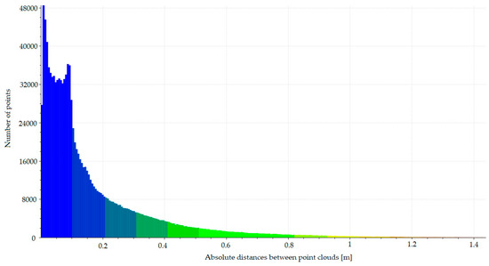 As a result of the data merging from terrestrial photogrammetry and laser scanning, the computed distances to individual points were presented by means of the module in the Cloud Compare software. It requires a more extensive explanation. Comparison between two point cloud models are shown in Figure 13 in the form of distances between points. The distances where the laser data were available (bottom part) range by a few centimeters only. The lack of TLS data results in a green to a red color change, which exceeds the value by 1 meter. It clearly shows what can be expected from both technologies, especially within a highly reflective or absorbing area, which is also highly inclined to the laser beam. In order to assess the results of data aggregation, it is crucial to create a histogram in groups where the data overlapped and no registration from one of the sensors. The histogram is presented in Figure 14.