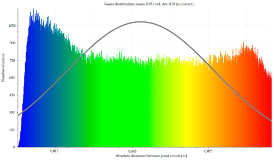 It is clearly visible in Figure 13 and Figure 14 that distances from data aggregation reach 10 cm. In order to assess the error of data aggregation, we separate the values from 0 to 10 cm and fit a Gaussian model to estimate the standard deviation corresponding to the Gaussian-type variable. This action indicates the accuracy of data aggregation, how they fit each other, to form the basis for hull modelling. The results of such an operation are shown in Figure 15 as a fit of a Gauss model. The standard deviation between the common set of points is about 0.03 m, but, in terms of modelling accuracy, there is a need to reflect distance distribution in a point cloud model. The results are shown in Figure 16. The values reaching 3 cm represent the parts of the hull modelled from the scanner with similar precision. The excess values can be observed especially on the boat’s edges, and at its bottom.