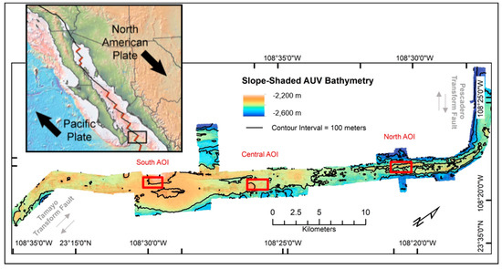 The Alarcon Rise is the south en-echelon ocean spreading ridge in the Gulf of California (black box in inset). Note that the map is oriented with north toward the upper right, and coordinate tics are spaced at 5 arc-minute intervals. The entire area of autonomous underwater vehicle (AUV) bathymetry at the Alarcon Rise is our study area, and three Area of Interest (AOI) locations (red boxes) referred to in this study are the volcanic shield (South AOI), volcanic cone (Central AOI), and high-silica ridge (North AOI).