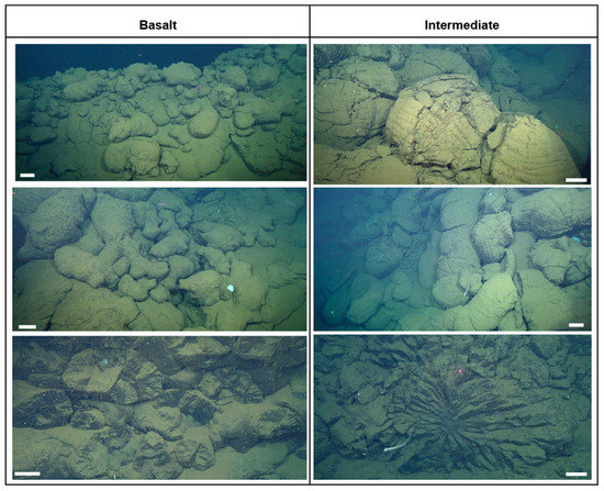 Basalt submarine lava morphologies are mainly controlled by lava effusion rate [5,6] sheet to pillow flows [6,7,8,9,10,11,12]. Lava containing more silica is typically described as large pillows for andesite or dacite composition (e.g., [13,14]) (Figure 2). In 2012, the first spreading ridge rhyolites were discovered along a faulted ridge and breccia-covered mound in Alarcon Basin [15].
