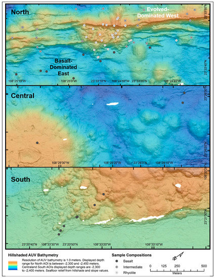 Examples of the distinct geomorphic provinces at the Alarcon Rise from Figure 1. Samples with basalts on mounds on the east and rhyolites cropping out on the ridge to the west were collected in the north AOI (top panel), which shows the rhyolitic dome and part of a 9 km-long ridge. The central AOI is dominated by a 700 m-diameter volcanic cone in the lower left of the map area shown (middle panel). The south AOI is dominated by a hummocky lava shield to the east side of the spreading axis (bottom panel).