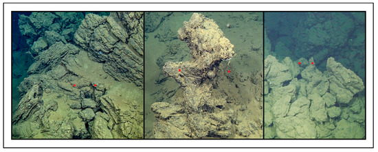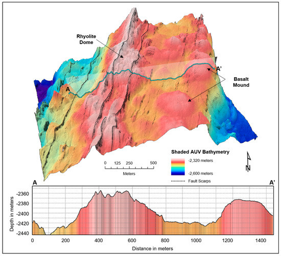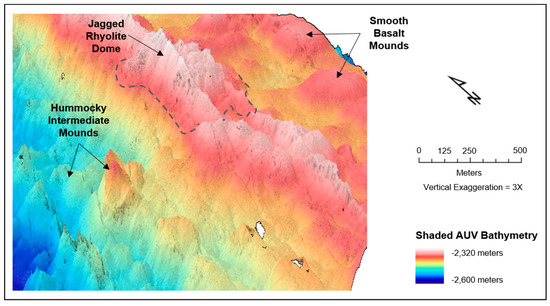 A ~500 m diameter rhyolite dome protrudes from the axial ridge (Figure 4). The rhyolite dome has a jagged surface composed of angular, blocky lava flows and breccia (Figure 5). Similar observations regarding submarine rhyolite domes constructed from elongated brecciated lobes >1 m in diameter and angular blocks of lava have been made in arc settings [18,21]. Rhyolite flows likely formed as autobrecciated, jagged, or “toothpaste” morphology.
