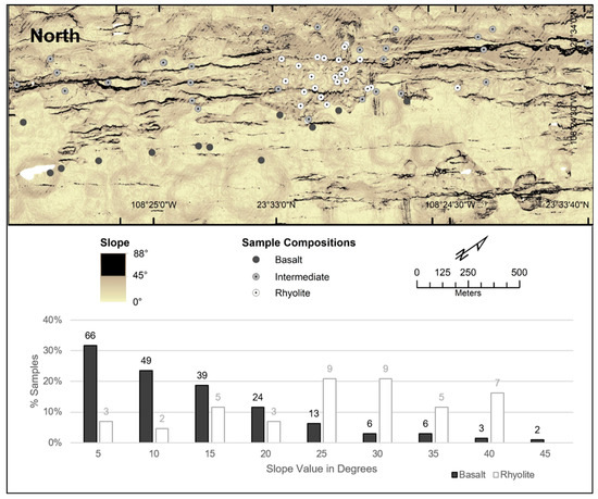 Slope (top panel) showing that rhyolites are associated with steep slopes, along with many intermediate compositions. Slope values >45° were only associated with faults and removed from the dataset used for lava morphology classification.