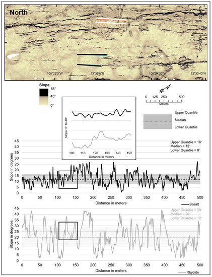 The top panel shows the locations of the slope profiles at the rhyolite dome (white lines) and on a basalt mound (black lines) shown in the lower two panels. The slope profiles were taken parallel to the axis to diminish any residual effects of faulting. Slope values for rhyolitic lava flows are consistently higher than those of basalt pillow mounds. Slope ranges of rhyolite flows are also greater than those of basaltic flows.
