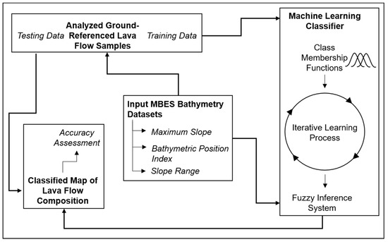 Here, we attempted a classification of basalts and rhyolites at Alarcon Rise using an adaptive neuro-fuzzy inference system (ANFIS) that has proven effective at distinguishing lava morphology using sonar data [32]. Artificial intelligence classifiers are powerful tools for mapping submarine volcanic features (e.g., [31,35,36,37]). ANFIS combines the processing power of an artificial neural network with fuzzy logic [38]. Neural networks mimic the human nervous system by using processing nodes (neurons) connected to one another via weighted paths. Fuzzy classification is particularly appropriate because it models the natural continuum of lava composition expressed through the changing geomorphology of submarine lava flows. Unlike hard classification systems that assume discrete boundaries between homogenous classes, ANFIS uses fuzzy logic to assign a continual grade to heterogeneous classes with indistinct boundaries [38,39]. This is the first study to apply fuzzy inference classification to classify seafloor lava compositions. Limitations of the current methods are that categorical groups designed by the classifier give very little sense of the uncertainty of the classification beyond standard accuracy assessment.