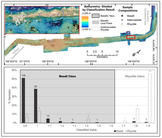 The vast majority of the Alarcon Rise was correctly classified as basaltic (light shading, top panel), with a rhyolitic signature (white outlines) dominantly in the north. Inset of the North AOI (red box) shows the majority of rhyolitic samples correctly classified with a rhyolitic fingerprint along with some intermediate samples classified as rhyolitic. The class break was chosen at a value of 1.7 because 75% of rhyolitic samples and only 3% of basaltic samples were classified with values equal to or above 1.7.
