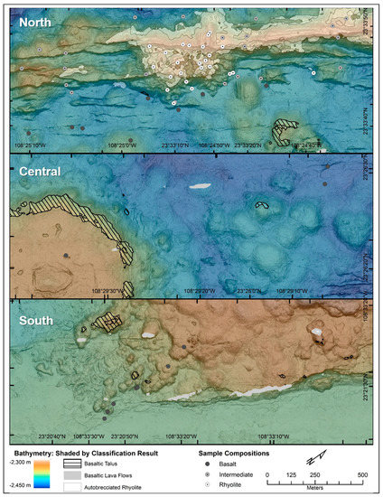 Following the sampling expeditions, Clague et al. [15] analyzed each sample for geochemical composition. Volcanic glass from most samples was basalt with MgO of 6.0–8.6 wt%; however, some samples collected from north Alarcon Rise (north AOI, Figure 1) had low MgO wt% and SiO2 57–78 wt%, corresponding to intermediate-to-felsic compositions [15]. Classification of rock type follows Clague et al. [15], with rhyolites containing SiO2 74–78 wt.%.