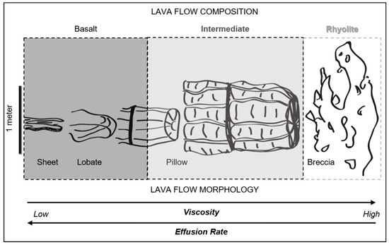 Changes in lava flow geomorphology and inferred emplacement processes with lava composition. Low-viscosity basaltic lava may erupt as sheet, lobate, or pillow morphologies depending on lava effusion rate. Lava flows with intermediate composition will emplace as pillows with diameters >1 m. The surfaces of these pillows will have striations ~10 cm deep, compared to basaltic pillows with striations ~1 cm deep. Rhyolitic lava flows will form jagged branches or may brecciate upon eruption.
