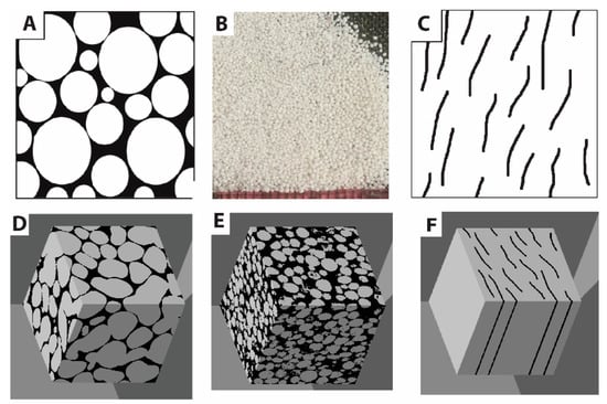 Examples of materials used to construct base images: (A) Binary 2D cartoon of nominal oolitic limestone structure, (B) loose grains of Bahamian ooids (ruler along base graduated in mm), (C) binary 2D cartoon of idealized simple fracture system. Additionally, (D–F) binary 3D models of solid (grey) versus pore/fracture (black), developed from (A–C), respectively. Note (D) and (E) represent the base models of oolitic limestone architecture prior to modification, and (F) is the base fracture network that was utilized to superimpose on (D) and (E) after the addition of cement. Scales in (A), (C) was 400 pixels × 400 pixels and in (D–F) was 400 voxels × 400 voxels × 400 voxels.