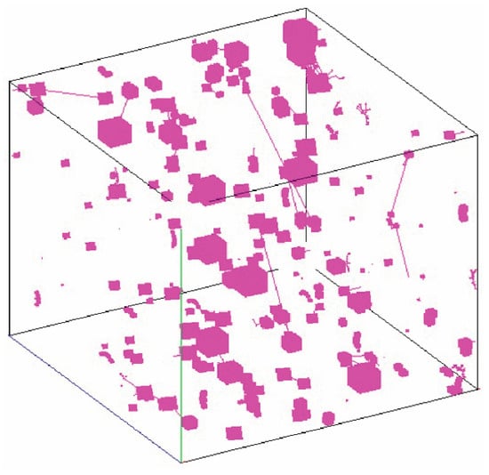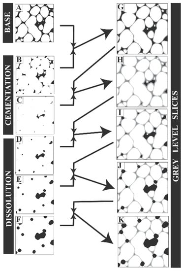 Numerous publications have dealt with the 3D modelling of geological porous media, such as sandstones and carbonates, producing stochastically constructed binary models of solid and pore distribution [,,,,,]. Such models typically use specialised software, require substantial computational effort and use training images based on pore-grain relationships recorded optically, or through scanning electron microscopy (SEM). As such they do not offer the possibility to model changes in cement formation, or the effects of dissolution with time, but are essentially frozen snap shots, from which porosity, permeability and other physical parameters can be reconstructed. A few notable exceptions to this [,] have attempted to model and illustrate various stages, or styles, of cementation. In particular, Kameda [] used MATLAB (MathWorks, Natick, MA, USA) to model grain-bridging, random pore fillings, quartz overgrowths and patchy cement formation.