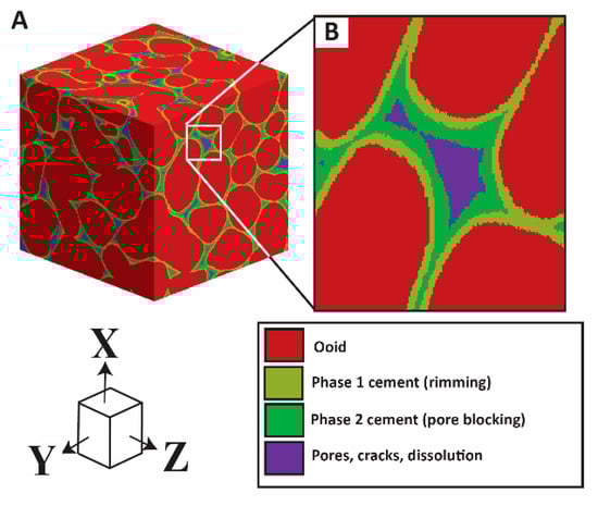 Both methods successfully mimicked the initial rimming cement phase and subsequent coarser sparry pore filling cements (Figure 4 and Figure 5). Although the technique does not directly replicate the detailed microstructure of these cements (fibrous radial and mosaic of larger equant crystals []), it does simulate the distribution of each phase; forming a simple rim that conforms to the shape of the ooid (phase 1) and terminating with residual pores with well-developed crystal faces (phase 2; compare Figure 3; Figure 4B,C; Figure 5B,C with Figure 6). Porosity and permeability values obtained are within the common ranges of many Jurassic and Triassic oolitic limestones [], suggesting that the values obtained for modelling cement formation are realistic.