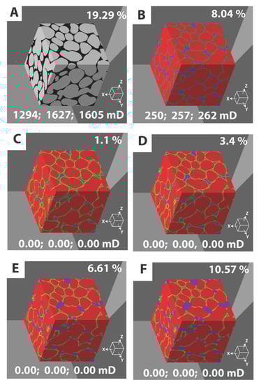 Three-dimensional models of oolitic limestone, developed from an X-ray tomography (XRT) scan of Bahamian ooids. (A) Base binary model of carbonate grains (ooids) and interparticle pores; (B) and (C) colourised grayscale 3D images representing phase 1 (riming) and phase 2 (pore blocking) cements; (D–F) as in (B), (C), but illustrating progressive pore dissolution. All images also show recorded porosity (top right), and permeability in the X, Y and Z directions (bottom); with results obtained through the use of the PAT software.