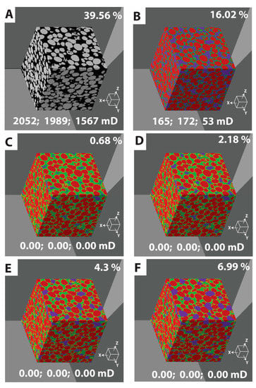 Three-dimensional models of oolitic limestone, developed from a cartoon based 2D image. (A) Base binary model of carbonate grains (ooids) and interparticle pores; (B) and (C) colourised grayscale 3D images representing phase 1 (riming) and phase 2 (pore blocking) cements; (D–F) as in (B), (C), but illustrating progressive pore dissolution. All images also show recorded porosity (top right), and permeability in the X, Y and Z directions (bottom); with results obtained through the use of the PAT software.