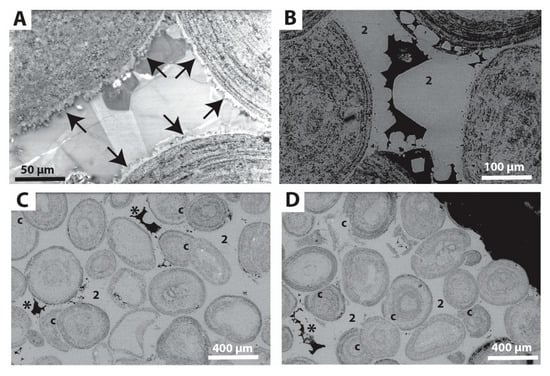 Scanning Electron Microscope (SEM) images of a typical Jurassic oolitic limestone, from a polished thin section. (A) Charge contrast image, illustrating rimming cement (arrows), and equant pore blocking cement; (B) backscattered (BSE) image illustrating pore blocking cement (2), and angular residual pores (black); (C) and (D) BSE images, with wider field of views, illustrating pore blocking cement (2), angular residual pores (*) and compacted grains (c). All images obtained in low-vacuum mode using an FEI Quanta FEG 650 SEM.