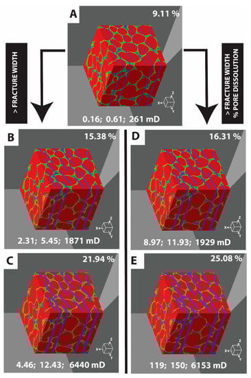 For models with dissolution of fractures and pores (Figure 7D,E), results were generally similar to those models that had undergone fracturing only. However, there was a notable small increase (compared to the fracture only models Figure 7B,C) of permeability in the X and Y directions, owing to the increased connectivity between fractures due to dissolution enlargement of pores.
